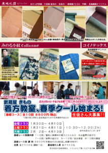 全国の様々な産地で作られる織物。その風合いの違いを最も感じることができるのが、「無地」です。通常の催し物で主役になることのない「無地」にスポットライトを当てることができるのは年末ならではのこと。紬産地はもちろん「ちりめん」など柔らかものの無地も取り揃えて、きもの好きの皆さまに「ほしいモノにあふれてる」催事をお目に掛けます。