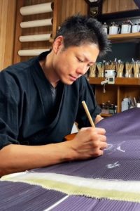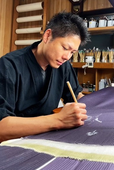 1979年 友禅作家 濱本信博の長男として京都に生まれる。1996年 府立山城高校サッカー部主将を務め、同年国体出場。2002年 大阪芸術大学建築学科卒。同年、着物卸問屋入社。2012年 父・濱本信博に師事。以降、絵師・染色家として新作着物の制作に取り組んでいます。[期間中、来場]