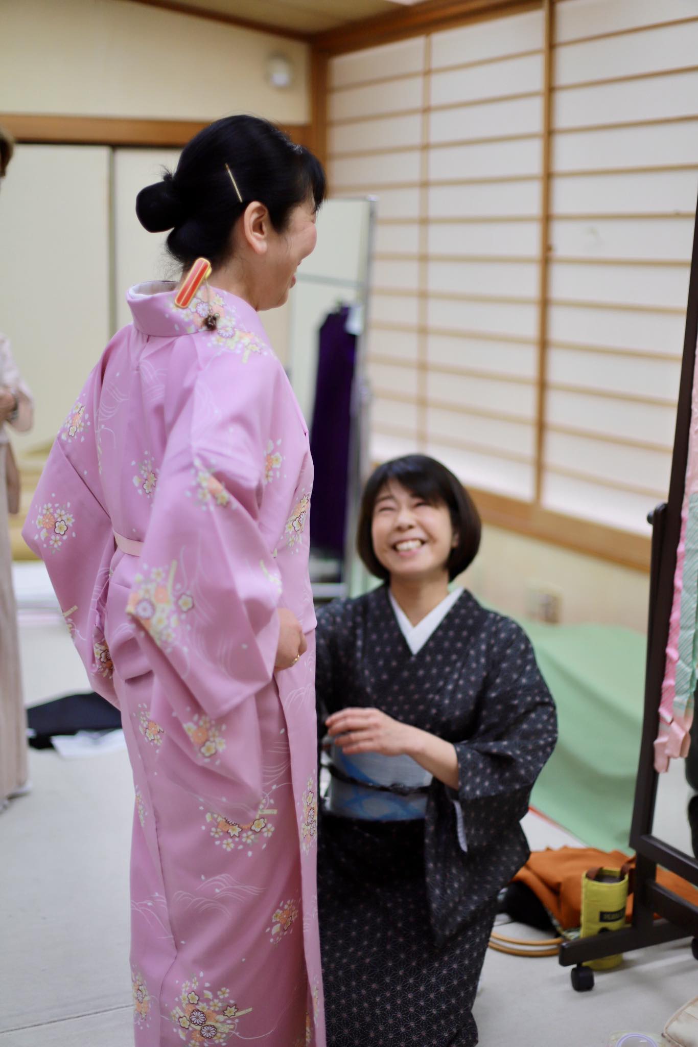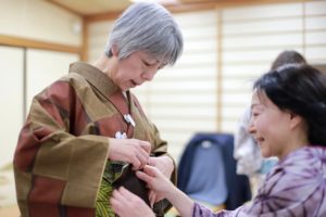 講習内容/きもの着方教室の受講を検討中の方向け。きものと長襦袢の着方と名古屋帯の締め方をひととおり学びます。まずは私たちときものを着てみましょう!
